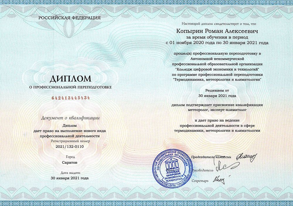 Квалификация по диплому: метеоролог, эксперт-климатолог.