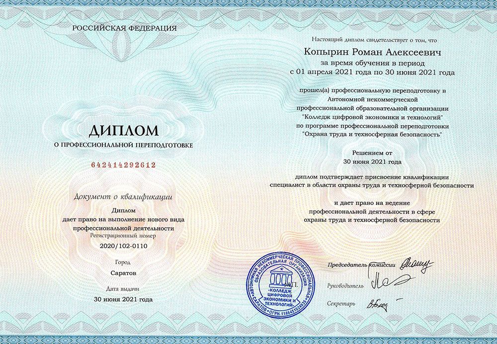 Квалификация по диплому: Специалист в области охраны труда и техносферной безопасности.