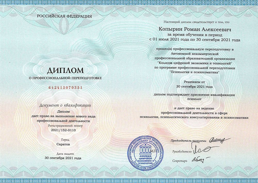Диплом о профессиональной переподготовке установленного образца. Дает право на ведение профессиональной деятельности, как в частных, так и в государственных организациях.