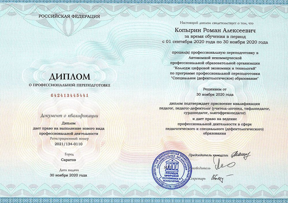 Квалификация по диплому: педагог, педагог-дефектолог (учитель-логопед, тифлопедагог, сурдопедагог, олигофренопедагог).