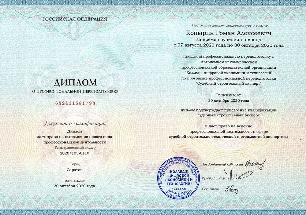 Квалификация по диплому: Судебный строительный эксперт.