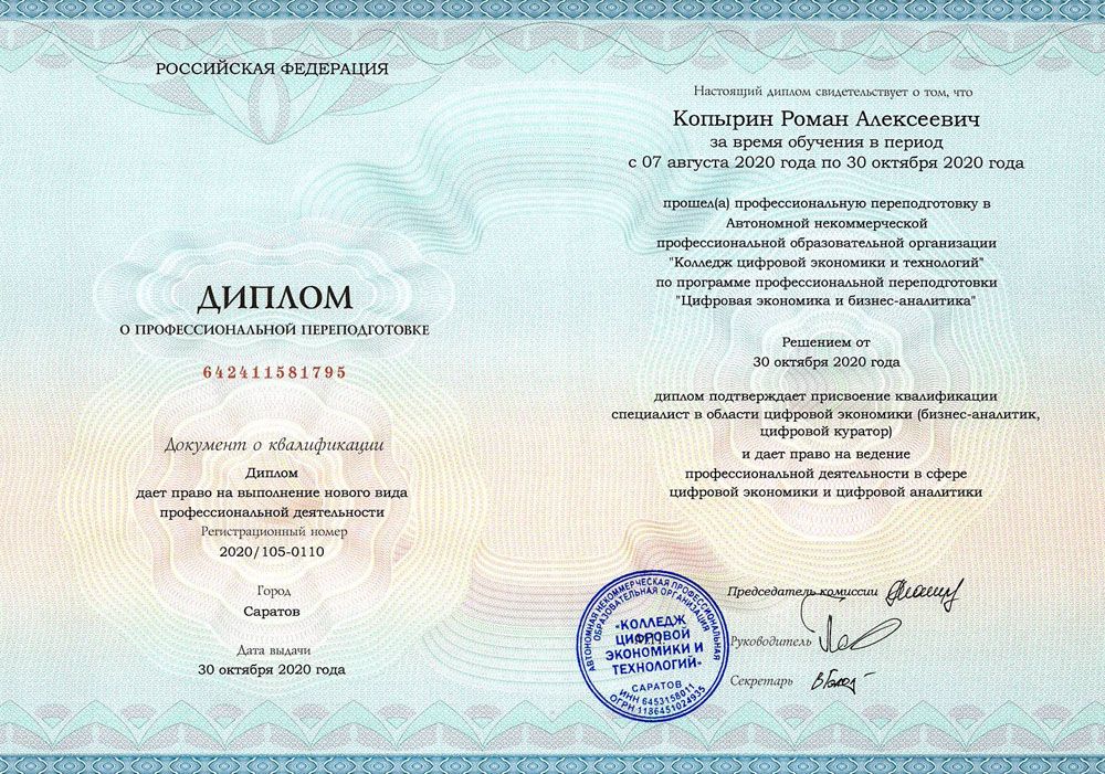 Квалификация по диплому: Специалист в области цифровой экономики (бизнес-аналитик, цифровой куратор).
