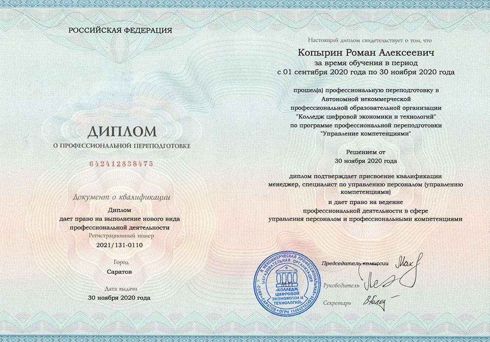 Квалификация по диплому: менеджер, специалист по управлению персоналом (управлению компетенциями).
